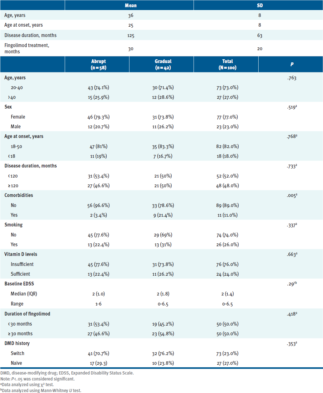 The cohort's mean age (± SD) was 36 (± 8) years. There were 77 women and 23 men, 76 individuals with low/insufficient vitamin D levels, and 26 smokers. Comorbidities were more common in the gradual tapering group (21.4%) than in the abrupt cessation group (3.4%) (P = .005). Baseline EDSS was similar between both groups, with a median value of 2. Half of the cohort was on fingolimod treatment for more than 30 months, and 73 individuals were switched to fingolimod from another DMD. Demographic and baseline disease characteristics were comparable across study groups (TABLE S1).