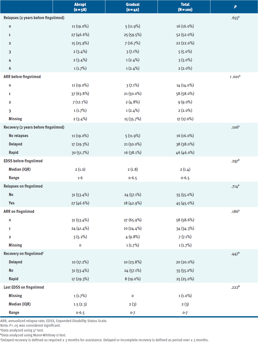Before fingolimod treatment, 84% of patients had a disease relapse within the previous 2 years; 45% had a relapse after beginning fingolimod therapy. The abrupt cessation group had a higher percentage of patients with an ARR of 1 or 2 during fingolimod therapy (46.6%) compared with the gradual tapering group (34.2%). Rapid recovery rates were comparable across study groups before and after fingolimod therapy. The median EDSS during fingolimod therapy was lower in the abrupt cessation group than in the gradual tapering group (medians 1.5 and 2, respectively) (TABLE S2).