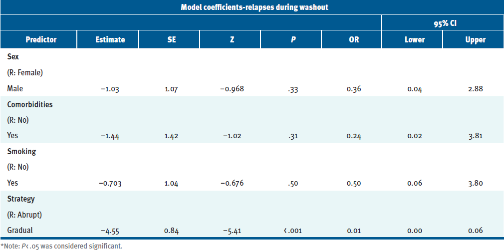 We analyzed the collected patient data using IBM SPSS Statistics 26.0 software. Categorical variables were reported as frequency (n) and percentage (%); quantitative variables were reported using descriptive measures such as mean, SD, and range. A χ2 test was used to determine the association among different risk factors with relapse occurrence during the washout. A P value of less than .05 determined significance. Multivariate logistic regression analysis was used to analyze the relationship between the dependent variable (relapses, yes/no) and multiple predictors or independent variables.