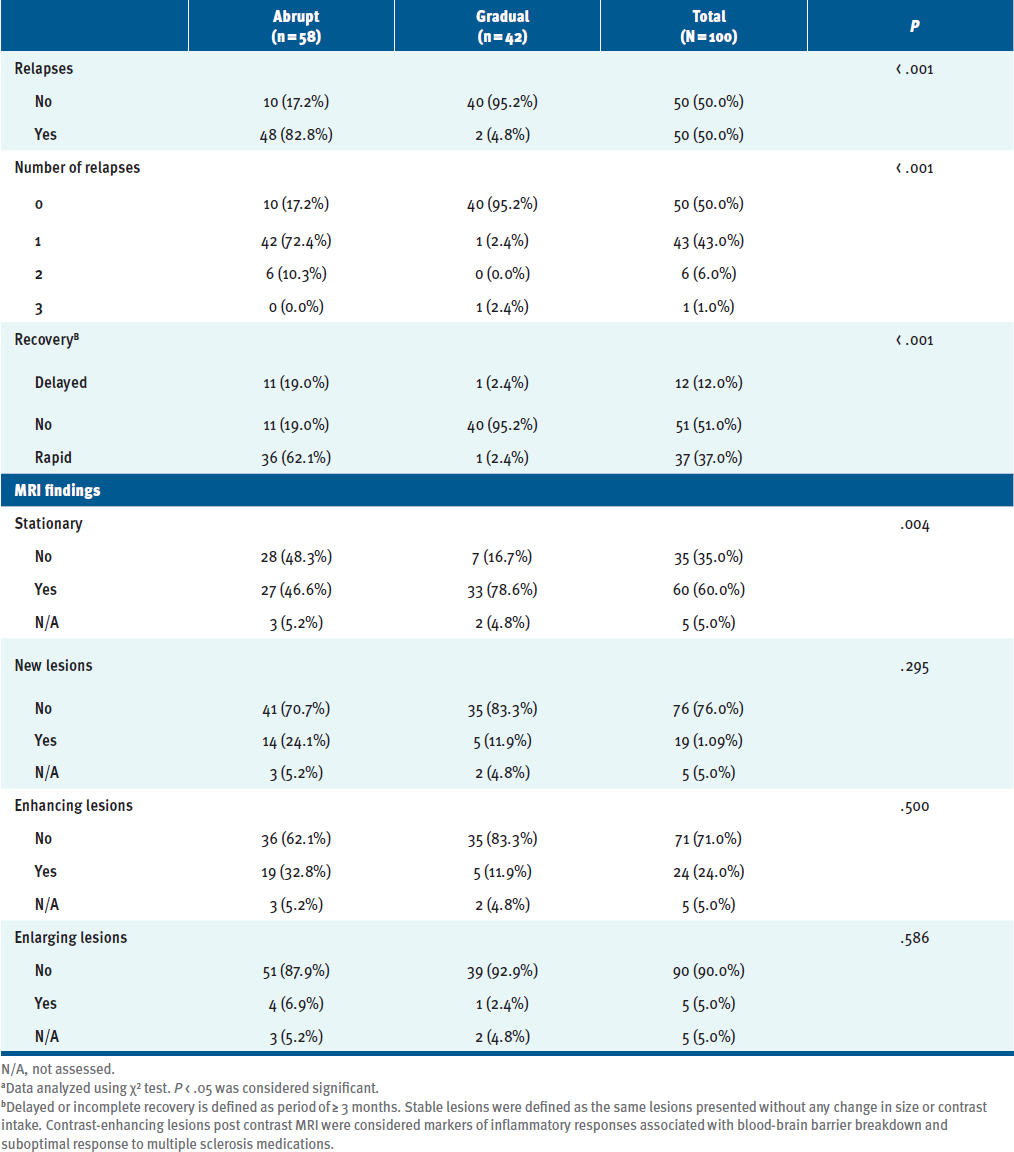 In a cohort of 100 patients, 58 had an abrupt cessation and 42 had a gradual tapering. Compared with abrupt cessation, gradual tapering was associated with a significantly lower rate of disease relapse (4.8% vs 81%, respectively; P = .001). Abrupt cessation also resulted in increased MRI findings of new lesions (24.1%; P = .29), enhancing lesions (32.8%; P = .5), and enlarging lesions (6.9%; P = .59); however, none of the MRI findings were significant. Other risk factors showed no significant association with disease relapse after fingolimod cessation.