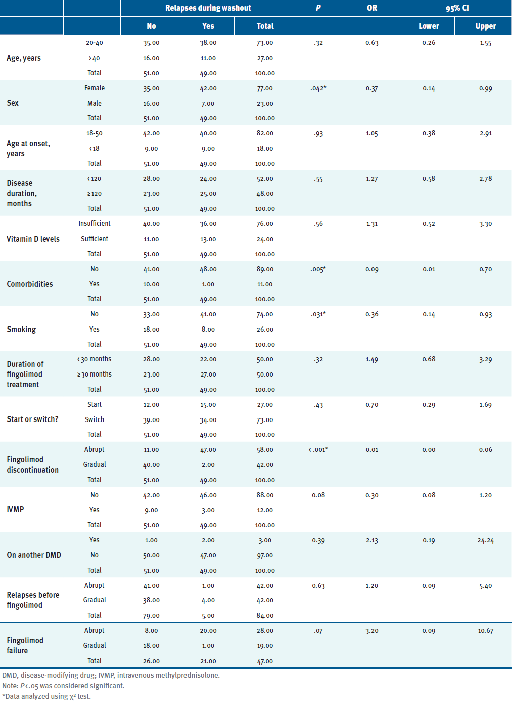 Female sex (OR, 0.37; 95% CI, 0.14-0.99), absence of comorbidities (OR, 0.09; 95% CI, 0.01-0.69), nonsmoking (OR, 0.36; 95% CI, 0.13-0.93), and abrupt cessation (OR, 0.012; 95% CI, 0.002-0.056) were found to be significant risk factors for MS disease relapse during the washout. Other factors, including age at onset, disease duration, vitamin D levels, duration of fingolimod treatment, switching to or starting on fingolimod, relapses before fingolimod, response failure on fingolimod, use of IVMP, and use of other DMDs had no significance on disease relapse. (TABLE 1).