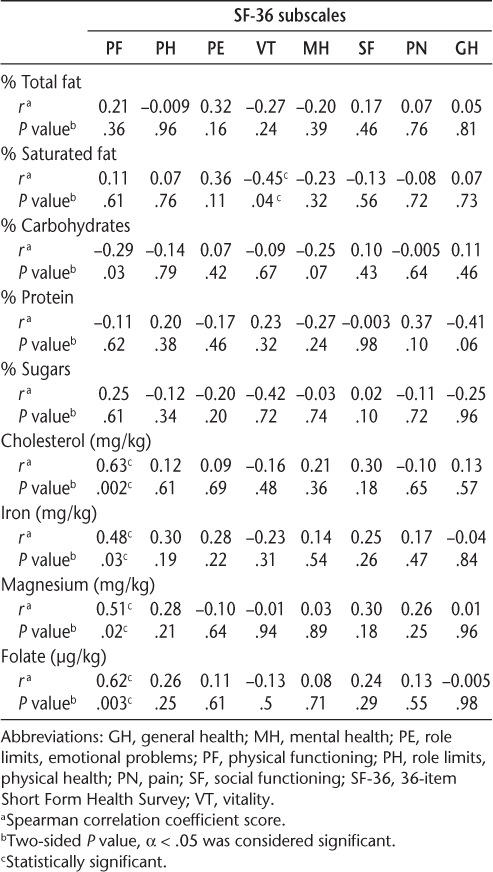 Table 3 is a summary of the relationship between the 3-day diet and the eight subscales of the SF-36. Overall, the direction of the relationship between the macronutrients consumed over the 3-day period and QOL were similar to the FFQ findings but did not reach statistical significance. The percentage of saturated fats consumed correlated with vitality, which measures general fatigue/energy (r = −0.45, P = .04). Different from the FFQ, the 3-day food diary established a direct relationship between cholesterol (r = 0.63, P = .002), iron (r = 0.48, P = .03), magnesium (r = 0.51, P = .02), and folate (r = 0.62, P = .003) and the physical functioning component subscale of the SF-36.
