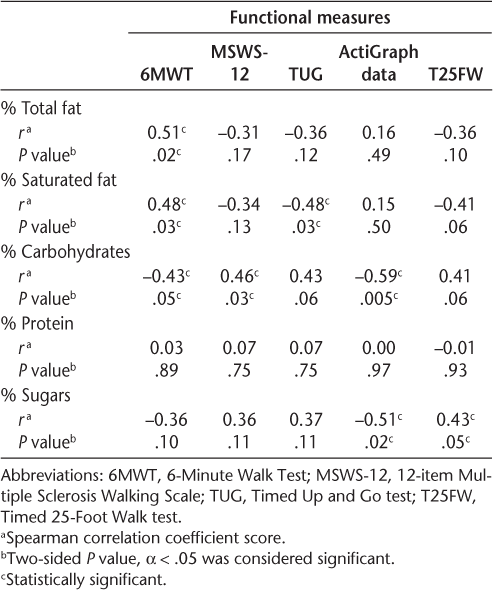 Table 4 summarizes the relationship between the FFQ and function. Carbohydrate intake was associated with reductions in distance covered during the 6MWT (r = −0.43, P = .05) and self-perceived walking ability (r = 0.46, P = .03) and with less physical activity (r = −0.59, P = .005). In contrast, diets higher in saturated fats were associated with increased distance covered during the 6MWT (r = 0.48, P = .03) and shorter TUG test times (r = −0.48, P = .03). Diets high in total fat were associated with improved 6MWTdistances (r = 0.51, P = .02), whereas diets high in sugar were associated with slower T25FW test results (r = 0.43, P = .05) and decreased physical activity (r = −0.51, P = .05).