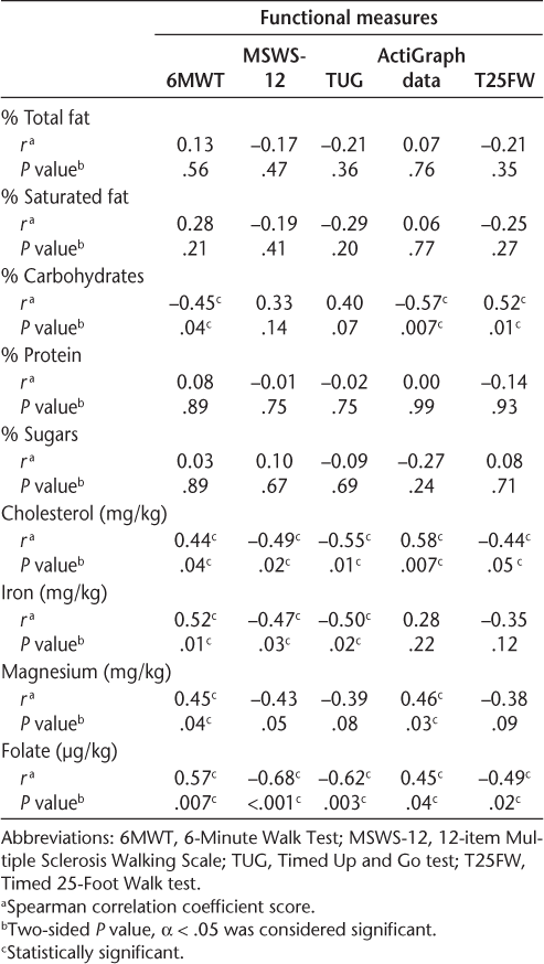 The relationship between the 3-day diet and functional performance is summarized in Table 5. The 3-day diet analysis also demonstrates a negative correlation between carbohydrate intake and the 6MWT distance (r = −0.45, P = .04), physical activity (r = −0.57, P = .007), and increased time during the T25FW test (r = 0.52, P = .01). The micronutrients cholesterol and folate were correlated with improvements in all functional tests (Table 5). Increased intake of iron was associated with improved 6MWT distance (r = 0.52, P = .01), self-perceived walking (r = −0.47, P = .35), and the TUG test time (r = −0.5, P = .02). Finally, magnesium levels were associated with increases in the 6MWT distance (r = 0.45, P = .04) and physical activity (r = 0.46, P = .03).