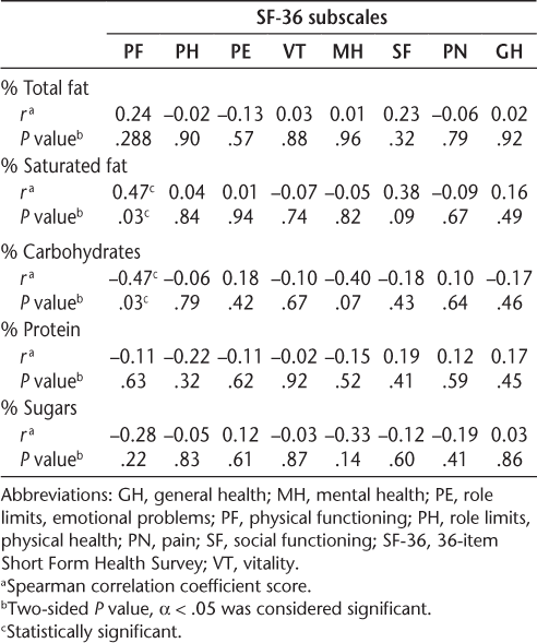 Table 2 summarizes the relationship between the FFQ and the eight subscales of the SF-36. The percentage of saturated fat consumed daily was positively correlated with the physical functioning subscale of the SF-36 (r = 0.47, P = .03). Similarly, the percentage of carbohydrates consumed negatively correlated with the physical functioning subscale of the SF-36 (r = −0.47, P = .03). No micronutrient correlations were statistically significant.