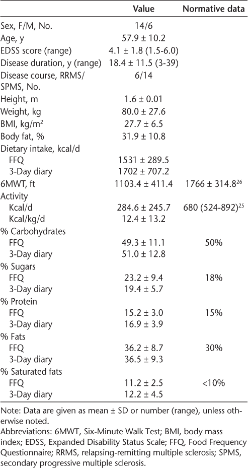 This cross-sectional pilot study included 20 ambulatory adult volunteers with MS (14 women and 6 men; mean ± SD age, 57.9 ± 10.2 years; mean ± SD Expanded Disability Status Scale score = 4.1 ± 1.8). Primary outcome variables included dietary assessment and the 6-Minute Walk Test (6MWT). Secondary measures included the Timed 25-Foot Walk test, Timed Up and Go test, daily activity, and three self-report questionnaires: the 12-item Multiple Sclerosis Walking Scale, the 36-item Short Form Health Survey (SF-36), and the Modified Fatigue Impact Scale.