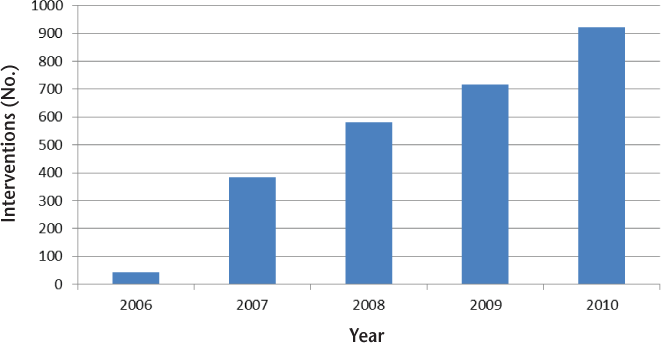 Based on £250 per bed-day,15 the 2002 to 2006 (before implementation) group seems more resource intensive against the cost of the service than the 2007 to 2013 (after intervention) group. The rate of specialist nurse–recorded complex interventions rose (Figure 1), which would be expected as a component of proactive management.