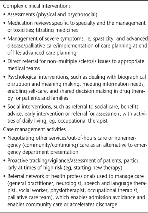 The proactive case management of MS plus rapid response to emerging clinical situations (physical and psychosocial) is central to reducing emergency care but requires clinical acumen and expertise because the nursing interventions offered were complex and multiple in nature, similar to those required in other long-term conditions.18,19 It is likely that this level of advanced practice could be offered only by an experienced practitioner.
