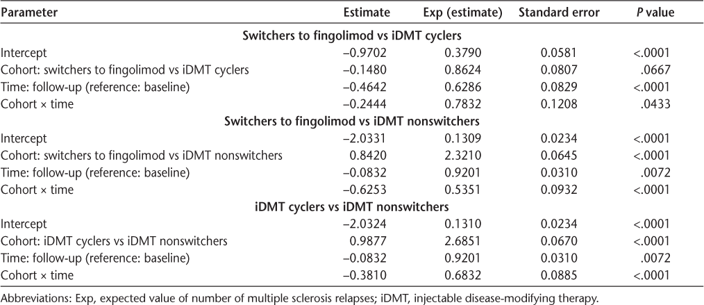 Clinical and real-world studies have shown significant reductions in multiple sclerosis (MS) relapses with fingolimod versus injectable disease-modifying therapies (DMTs). Multiple sclerosis relapse rate and incidence were compared in patients switching from an injectable DMT to fingolimod and those cycling from one injectable DMT to another or remaining on their original injectable DMT.