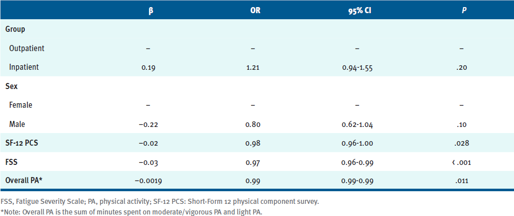 The secondary analysis provides clinicians with information on which people with MS were most likely to increase PA levels following a usual-care gait and balance rehabilitation period. Perceived fatigue at baseline was the most significant predictor of a positive change. For each point less on the FSS at T0 (being less fatigued), the probability of increasing the number of daily steps by at least 800 steps after rehabilitation increased by 3%. Results of a recent large study showed that fatigued people with MS took fewer daily steps and had fewer MVPA minutes than nonfatigued people with MS, suggesting that perceived fatigue is an important aspect to consider when planning interventions.43 Similar findings were reported by other authors regarding the relationship between perceived fatigue and PA.44,45 The data indicate that fatigue in people with MS significantly affects daily activities and overall QOL and also limits their ability to engage in and sustain PA. Fatigue can be a barrier to achieving the benefits of rehabilitation programs, and in light of our findings, addressing this aspect of MS during physiotherapy appears to be essential.