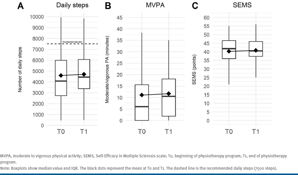 Forty-one people with MS undergoing physiotherapy with a median (IQR) age of 54.00 (17.00) years and an Expanded Disability Status Scale score of 6.00 (2.00) points were assessed on the first days (T0) and last days of their rehabilitation period (T1), and 6 weeks after it ended (T2). Instrumental assessment utilized Fitbit Versa trackers, measuring daily steps and moderate/vigorous PA engagement (MVPA). Self-efficacy, perceived fatigue, walking ability, and quality of life were measured using the Self-Efficacy in Multiple Sclerosis scale (SEMS), the Fatigue Severity Scale, the 10-Meter Walk Test, and the Short Form-12 Health Survey.