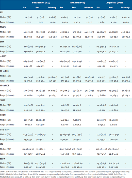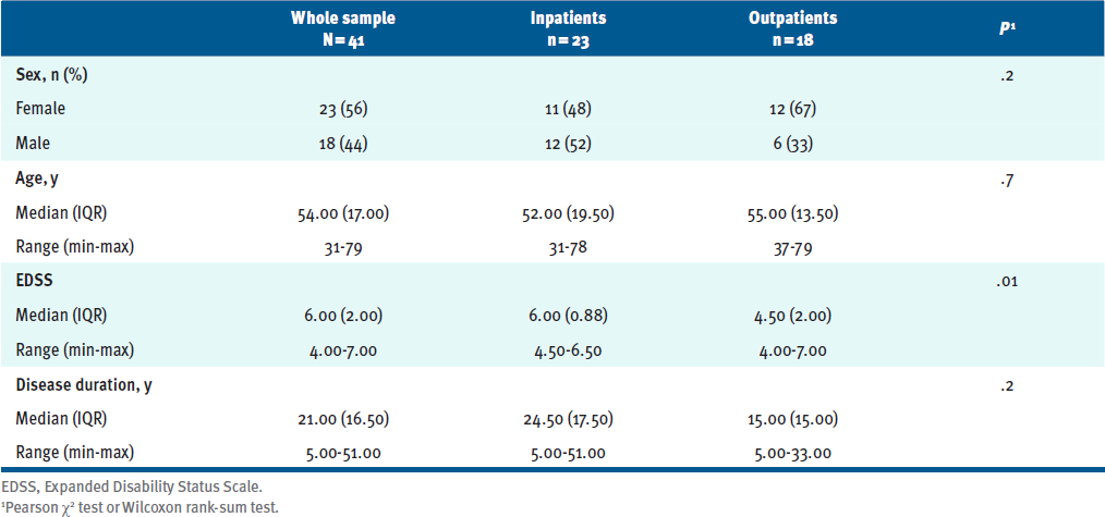 All screened participants with MS were included in the final study sample: 41 people with MS with a median (IQR) age of 54.0 (17.0) years and an EDSS score of 6.0 (2.0) points. TABLE 1 reports the complete demographic and clinical information at baseline. Inpatients (n = 23, 11 women) and outpatients (n = 18, 12 women) had comparable ages and disease durations; however, the groups differed in disability level (P = .01); inpatients had an EDSS of 6.00 (0.88) and outpatients 4.50 (2.00).
