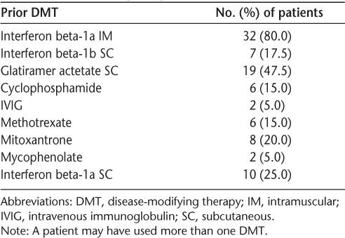Of the 40 patients, there were 31 females (77.5%) and 9 males (22.5%). The mean (SD) age was 48.5 (6.87) years. The mean number of natalizumab infusions was 11.4. Prior DMT use included most FDA-approved medications and some immunosuppressants (Table 2). The mean (SD) EDSS score at baseline was 4.59 (1.24). The mean (SD) BDI-II score at baseline was 13.3 (10.5). The mean (SD) neuropsychological impairment rating at baseline was 0.49 (0.21). Standard cranial MRI with and without contrast enhancement was performed on a 1.5-T magnet before initial treatment with natalizumab.
