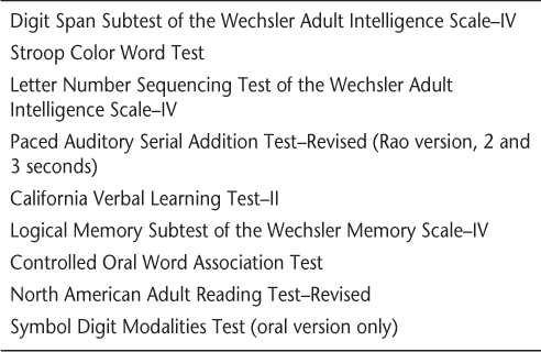 Multiple sclerosis (MS) is an autoimmune disorder of the central nervous system (CNS) that causes progressive neurologic disability by a combination of inflammation, demyelination, and axonal degeneration. Axonal degeneration and permanent disability may occur even at early stages of the disease.1–3 Several observational studies using the Expanded Disability Status Scale (EDSS) to measure change in functioning over time have revealed much about the natural history of MS disability.4 5 Physical disability as measured by the EDSS has been shown to be reduced, compared to placebo, by several of the currently available disease-modifying treatments (DMTs) that have been approved by the US Food and Drug Administration (FDA) for relapsing forms of MS. However, 50% to 65% of MS patients may develop neuropsychological impairment during the course of the disease.6–10 Because such impairment is a major cause of disability in MS patients, the importance of assessment of cognitive function in MS cannot be overestimated.6–8