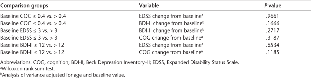 Comprehensive neuropsychological performance improved from a mean Neuropsychological Impairment Index score of 0.49 at baseline to a mean score of 0.41 at the time of retesting (P = .0002). Depression ratings on the BDI-II improved from a mean score of 13.30 to a mean score of 10.85 (P = .001). The mean EDSS score improved from 4.59 to 4.29 (P = .02). A total of 52.5% of patients showed neuropsychological improvement, while 30.0% showed no change and 17.5% had worsening. Although all three functional measures improved, there was greater improvement in cognition than in depression or disability rating. Analysis of variance adjusted for age and baseline values did not show any statistically significant correlations between cognition and depression or EDSS score with specified baseline conditions (Table 3).
