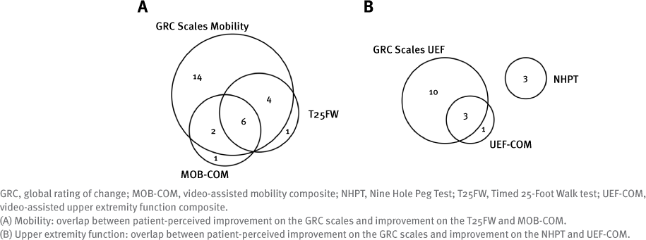 The overlap between improvement on the GRC scale and the conventional and video-assisted composite measures is depicted in FIGURE 2. In total, 26 of 39 patients (66.7%) reported improvement in mobility on the GRC scales. Of these patients, the number also showing improvement on the T25FW and the MOB-COM was similar (10 and 8 patients, respectively) and largely overlapped (6 of 12 patients). Concerning UEF, 13 patients (33.3%) reported improvement on the GRC scales. Although no overlap could be detected between these patients and those showing improvement on the NHPT (n = 3), an improved UEF-COM largely concurred with GRC scales improvement (n = 3 of 4).
