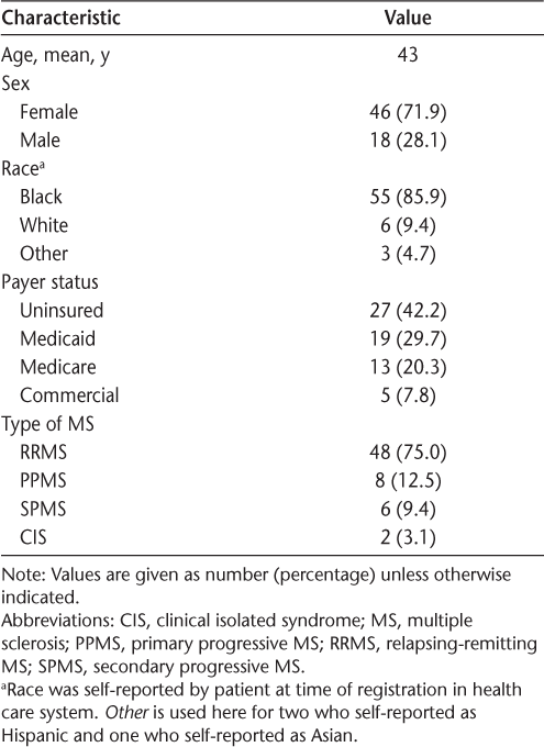 Specialty medications, such as DMTs used in MS treatment, are associated with increased clinical complexity. As a result, a high level of care must be dedicated to medication therapy management for patients with MS. Disease and specialty care management programs aimed at improving medication adherence, disease awareness, and adverse effect management for patients with MS have been described previously in the literature.3,9–11 Studies evaluating the effects of these programs have found that pharmacists and support staff working in specialty pharmacies lead to improved adherence to MS treatment regimens.3,9,11 However, these studies included an integrated specialty pharmacy model that requires substantial time and resources to build that may not be feasible for all health care systems. Furthermore, most patients included in these studies had functional prescription insurance coverage. In addition to financial barriers in obtaining medications for uninsured patients, these patients face socioeconomic factors that affect health care quality. In a survey conducted by Iezzoni and colleagues,12 36.8% of uninsured patients reported having never taken their MS medications compared with 21.2% with health insurance. The findings from this study are unique because they describe clinical pharmacy services provided to a largely uninsured patient population with MS in a hospital-based setting without an integrated specialty pharmacy. Furthermore, this study provides insight into the role of a clinical pharmacist directly integrated into a multidisciplinary team of providers in a neurology clinic.