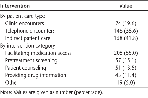 Retrospective medical record review was used to describe the roles and responsibilities of the clinical pharmacist in MS patient care. All patients seen in the neurology clinic for MS management between April 1, 2017, and June 1, 2018, with documented interventions by a clinical pharmacist were included. Interventions were documented in patient electronic medical records as either direct patient care (clinic or telephone encounters) or indirect patient care. Interventions were placed into one of five categories: facilitating medication access, pretreatment screening, patient counseling, providing drug information, or other. The total number of clinical pharmacist interventions as well as the average number of interventions per patient in direct patient care encounters were recorded.