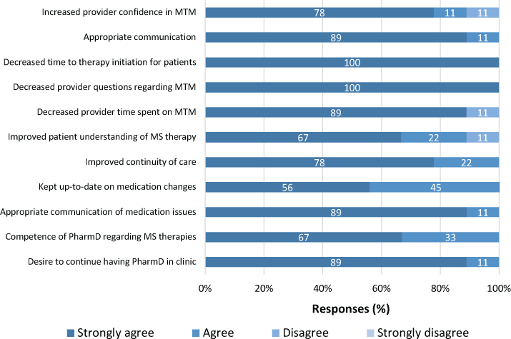 All providers strongly agreed that involving a clinical pharmacist in MS patient care decreased the number of questions they received regarding medication management and decreased time to therapy initiation (Figure 2). In addition, providers agreed or strongly agreed that the clinical pharmacist was competent in selecting treatment options and improved continuity of care for their patients. All providers surveyed reported that they desired to continue having clinical pharmacist assistance with their patients with MS.