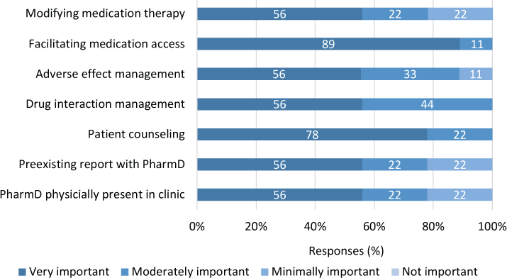 All providers surveyed reported that facilitating medication access, managing drug interactions, and providing patient counseling were moderately or very important services provided by clinical pharmacists in MS patient care (Figure 1). Providers indicated that the most impactful clinical pharmacy service provided to patients was facilitating medication access, with 89% of providers indicating that this was very important to patient care. No services evaluated were deemed not important to MS patient care. However, 22% of providers indicated that having a preexisting rapport with the clinical pharmacist before their involvement and having the pharmacist physically present in the clinic was of minimal importance to clinical pharmacy impact.