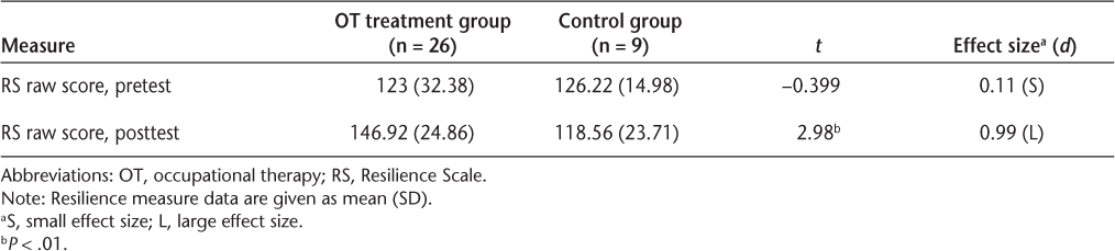 Pretest and posttest resilience measures for OT treatment group vs. control group
