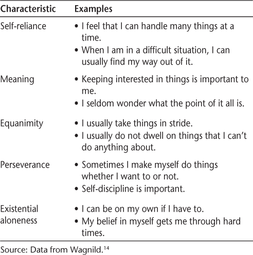 Built upon a construct that addresses one's ability to endure and persist despite hardship or challenge, the Resilience Scale (RS) was first developed in 1990 as a way to measure resilience in individuals who were able to adjust successfully after a major life event.5 It has since been applied to a variety of populations, from adolescents to the elderly, with diverse racial and ethnic backgrounds and conditions.7 14 The RS is a 25-item, self-report, 7-point Likert scale based on five characteristics of resilience that are related to “acceptance of self and life” and “personal competence”: self-reliance, meaning, equanimity, perseverance, and existential aloneness. 14 Table 1 provides examples from the RS that relate to each of these characteristics. Internal consistency for the RS was reported to be strong (r = 0.91, P < .001); concurrent validity was measured against assessments related to relevant constructs, such as life satisfaction, morale, depression, and health, with significant correlations at the P < .001 level.5 Although there is no “gold standard” for measures of resilience, the RS has been noted to be among the strongest instruments with construct validity, and is the most applicable to a variety of populations.15 It has also been used as a test-retest measure of resilience.16