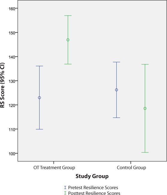 This pilot study raises additional questions that may be addressed through future research. The RS consists of 25 statements addressing different conceptual components of resilience. Exploring which components are most influential in this population is an area for future research. Additional areas for study include the relationship between resilience and quality of life; the specific impact of OT on resilience, using an experimental design; and the role of coping strategies embedded in an OT program and their effect on resilience. It would also be interesting to measure the durability of the improved resilience of the OT treatment group 6 months after discharge from OT.