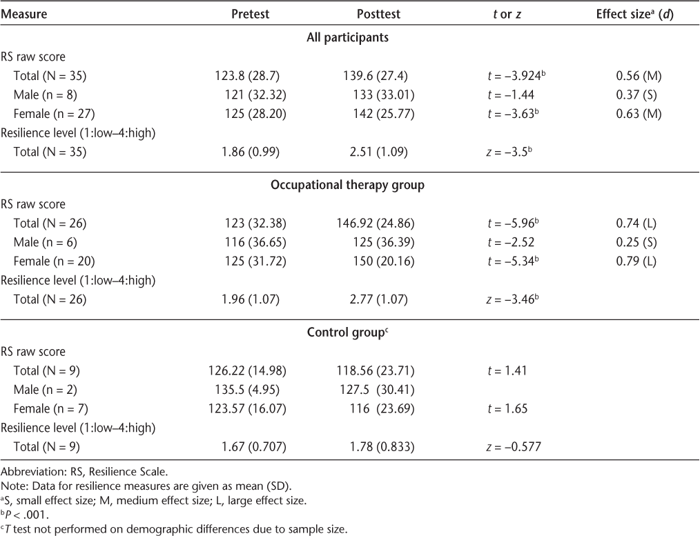Some gender differences in resilience were found. Just over three-quarters of our entire study sample consisted of women. Women's resilience overall and in both the OT treatment group and the control group improved significantly. Men's resilience in these two cohorts also increased, but not significantly. The small sample size of men may account for the nonsignificance of the improvement. However, studies have identified the multiple roles women have and their opportunities to engage in social networks as being linked with resilience.27 Social factors also played an important role in our study, possibly accounting for women's improvement in resilience.