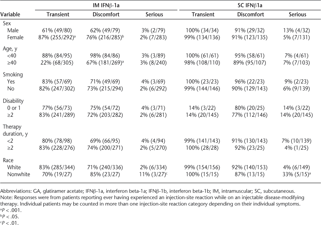 For IM IFNβ-1a, SC IFNβ-1b, and GA, female sex and younger age were significantly associated with moderate ISRs, including perceptions of discomfort. Female users of IM IFNβ-1a and GA reported more transient ISRs than did male users (Table 3). Also, nonwhite patients receiving IM IFNβ-1a, SC IFNβ-1a, and GA reported more severe reactions than whites. Smoking, therapy duration, and disability level were not significantly associated with any category (transient, discomfort-causing, or serious) of skin reactions.