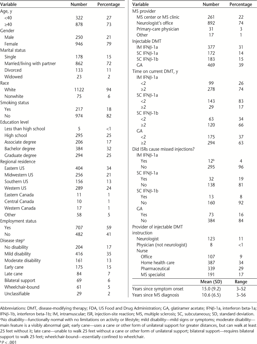 Data for the MS-ISR survey were collected in 2007, with a total of 1380 eligible patients with MS providing responses. However, 179 (13%) respondents did not provide information on DMT use, leaving 1201 responses for analysis. Not all respondents answered all questions; thus, the number of patient responses to each question is a subset of the total number of 1201 useful responses. Patient demographics are reported in Table 1.