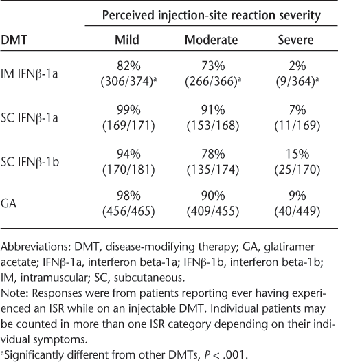 Multiple studies and clinical experience have demonstrated that ISRs are a common side effect of injectable DMTs.21–23 It is also clear from the present data set and multiple other reported studies that less severe ISRs are reported with IM IFNβ-1a than with the other injectable DMTs for MS.14 24 25 Our findings on the frequency of ISRs (Table 2) generally conform with what has previously been reported and underscore the deleterious effect that ISRs have on treatment continuation and adherence.9 25 26 These data highlight the need for continued study of these side effects and their causes and for continued patient education to alleviate symptoms, maintain compliance, and positively affect long-term MS outcomes.