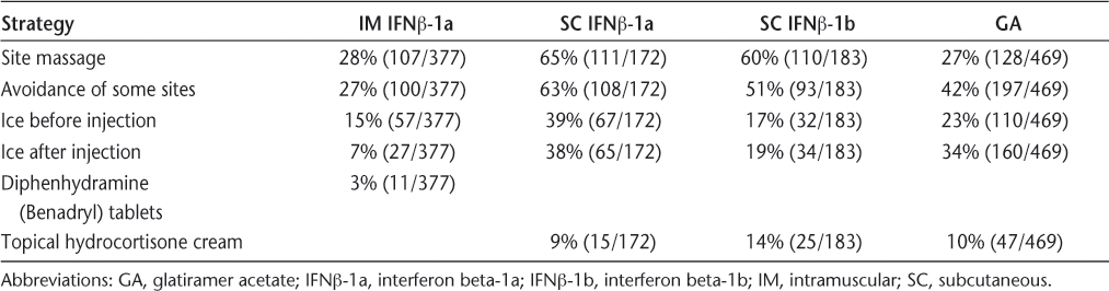 The specific strategies used to manage ISRs were similar among users of each of the four injectable DMTs, with a group of six management strategies constituting the top five strategies for all four injectable DMTs (Table 4). The top two management strategies, injection-site massage and avoidance of sensitive injection sites, were identical across all four injectable DMTs. In addition, of the 55% of all respondents who used SC autoinjectors, 24% reported that autoinjectors ameliorated their ISRs.