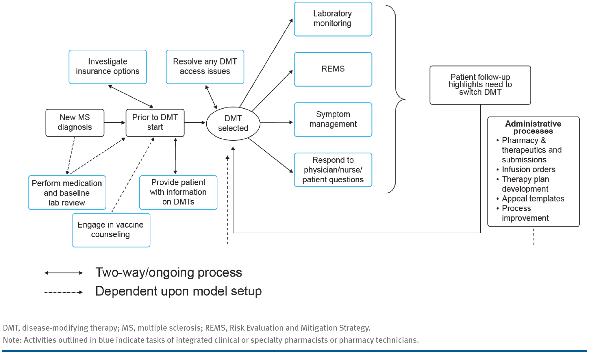 Traditionally, requests for lab tests are placed by the provider and reviewed at or after clinic visits. These tests may be sourced to offsite locations, making ordering and result tracking complicated and time-consuming. Consequently, test results may be delayed if the patient fails to attend the scheduled clinic visit or if the clinic workflow is not synchronized with lab processes. An integrated pharmacy team could set up an active laboratory monitoring system and protocol that reviews required DMT lab tests to provide a more efficient, safe monitoring system.