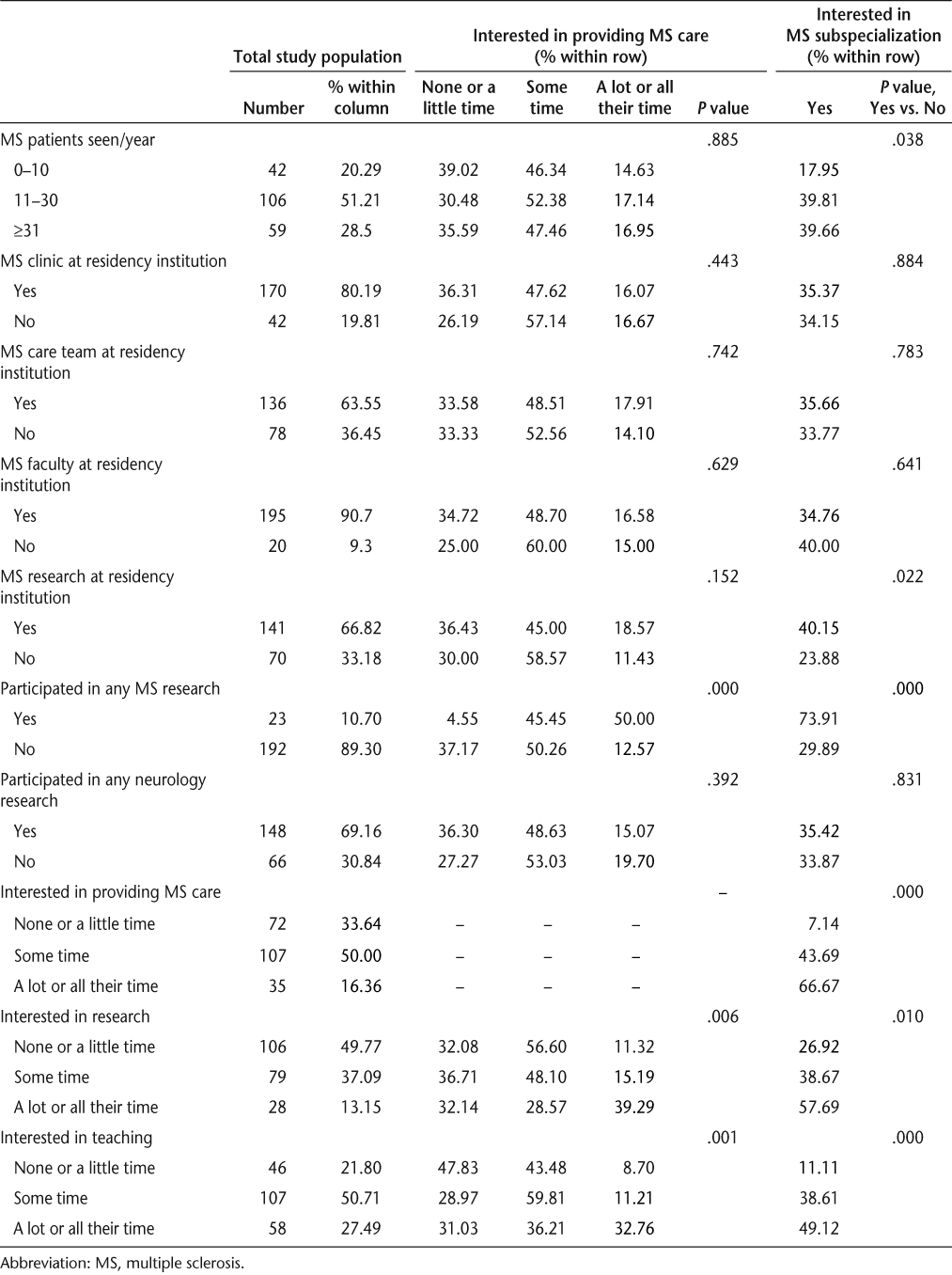 Relationship of MS patient exposure during residency and research/teaching plans with interest in MS care and interest in providing MS subspecialization
