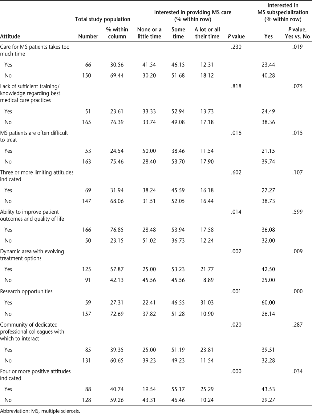 Relationship of attitudes toward MS patient care with interest in providing MS care and interest in MS subspecialization