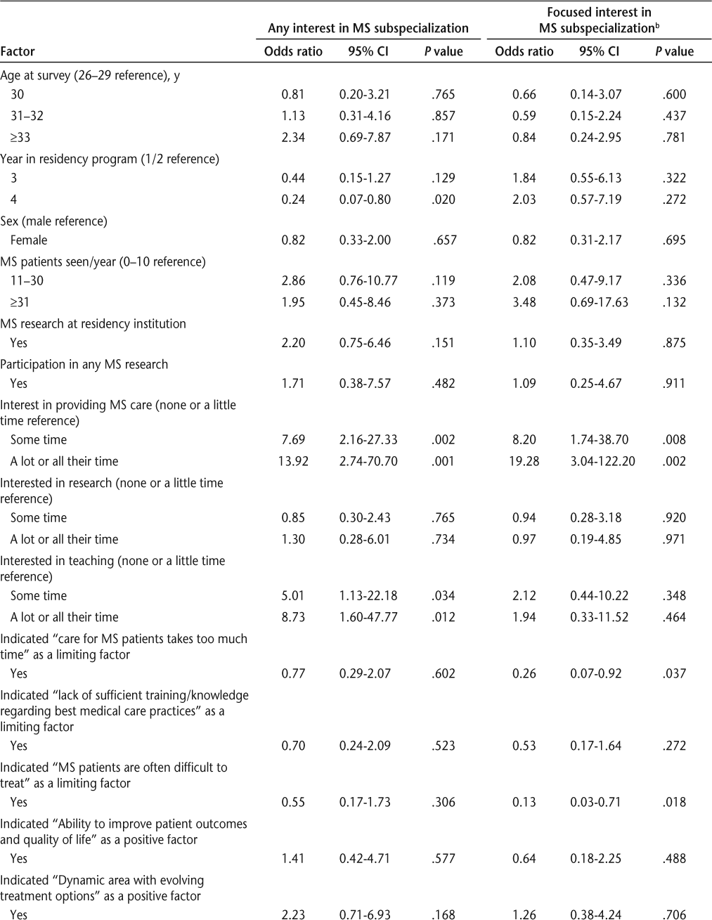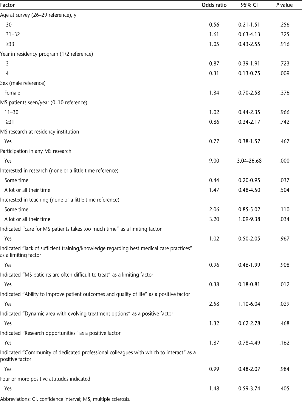 Results: Residents were significantly more likely to have increased interest in MS care when they participated in MS research, were interested in teaching, and indicated that the “ability to improve patient outcomes and quality of life” was a positive factor influencing their desire to provide MS patient care. Residents who were interested in providing MS care, interested in teaching, and indicated that “research opportunities” was a positive factor for providing MS patient care were significantly more likely to express interest in MS subspecialization.
