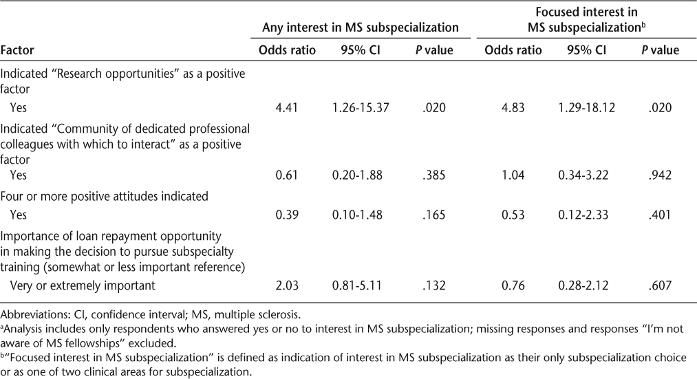 Logistic regression analysis of factors associated with interest in MS subspecializationa