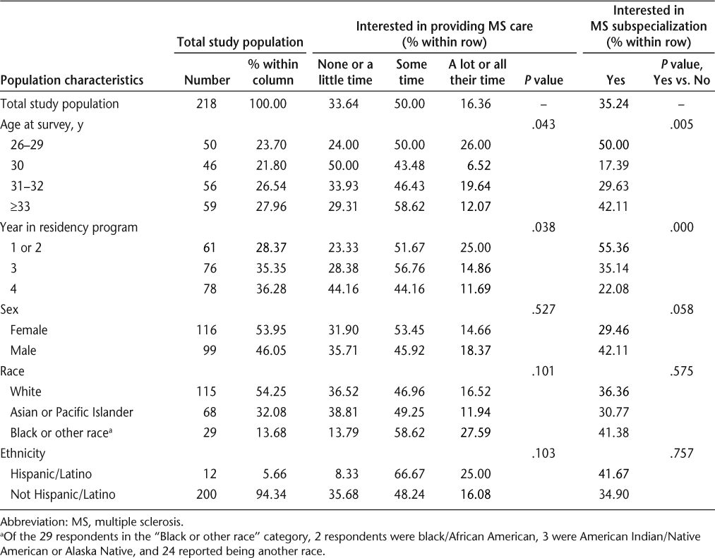 The study population consisted of 218 neurology residents. After excluding 4 neurology residents who did not respond to the question on interest in providing MS care, 142 (66%) expressed interest in providing MS care (ie, indicated that they would like to devote at least some of their time to providing MS care) and 72 (34%) were not interested. After excluding 8 neurology residents who were not aware of MS fellowships or did not respond to the question, 74 (35%) expressed interest in MS subspecialization and 136 (65%) were not interested.