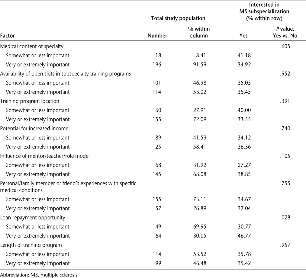 Relationship of factors potentially influencing the decision to pursue subspecialty training with interest in MS subspecialization