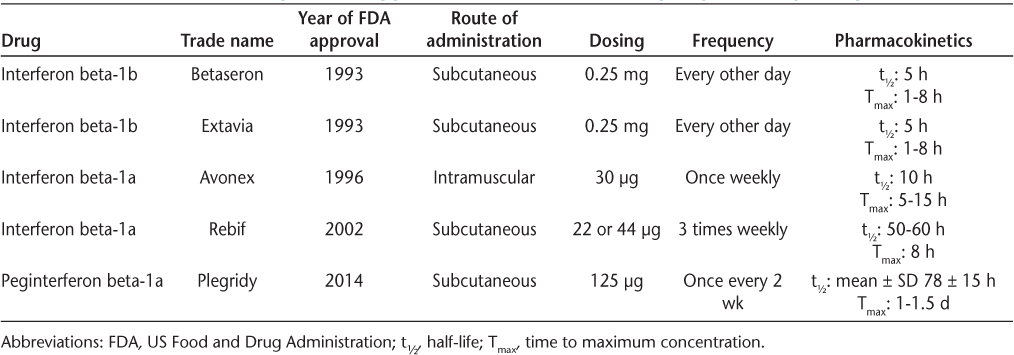 The route of administration, dosing, and dosing frequency for the various interferons approved to treat relapsing-remitting MS (RRMS) are shown in Table 1.8–12 The dosing frequencies of the interferon formulations differ from every other day (SC IFNβ-1b) to every 2 weeks (SC peginterferon beta-1a).
