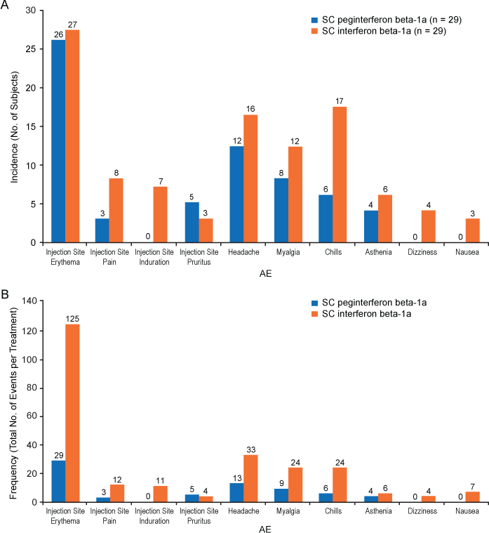 (A) Incidence and (B) frequency of adverse events (AEs) related to study drug occurring in more than 10% of participants after treatment with either peginterferon beta-1a (n = 29) or subcutaneous (SC) interferon beta-1a (n = 29) in the COMPARE study 19