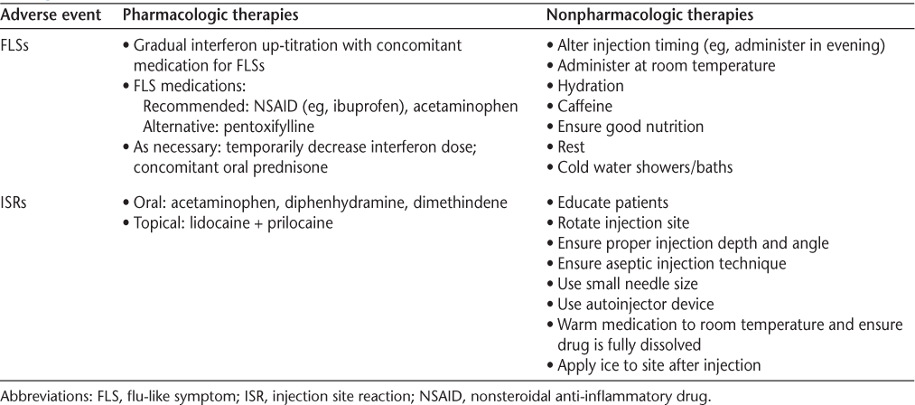 Patients taking interferon may experience several AEs, including headaches, muscle aches, flu-like symptoms, and ISRs, which can all negatively affect the patient’s quality of life and desire to continue treatment. To maximize interferon treatment adherence and, thus, therapeutic efficacy, it is important to proactively manage AE symptoms (particularly flu-like symptoms and ISRs) in all patients, including those switching between interferon and noninterferon DMTs, those switching between IM and SC IFNβs, and those naive to DMT treatment. Table 2 summarizes recommended pharmacologic and nonpharmacologic mitigation strategies for common AEs associated with IFNβ therapies.64–66 The primary management strategy for flu-like symptoms and ISRs is gradual dose titration over 4 to 6 weeks. Analgesics and/or antipyretics, such as ibuprofen or acetaminophen, are often administered concurrently to prevent the onset of symptoms.67,68 It is especially critical that patients be educated regarding the timing and impact of flu-like symptoms and ISRs and how to reduce/prevent such AEs using over-the-counter medications and other self-care practices, such as hydration, diet, and rest.64 Most patients who experience flu-like symptoms or ISRs can administer doses in the evening, such that they sleep through the time during which they would otherwise experience symptoms.67–69 Understanding the timing of AEs may be of particular importance when considering the potential for patients treated with PEG-IFNβ-1a to potentially experience flu-like symptoms or ISRs of extended duration.58