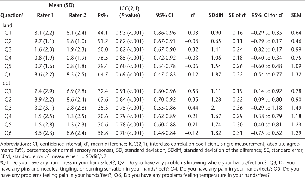 Good ICC(2,1) values, greater than 0.75 (P < .001), for the VAS were found for the hands and feet for question 1, relating to having numbness, and question 3, relating to having pins and needles, tingling, or burning sensation (Table 3). These results are supported by low SEM values and low mean difference values. For questions 2, 4, 5, and 6, the ICC(2,1) values ranged from 0.60 (P < .001) for question 5, relating to having problems feeling pain in the hands, to 0.85 (P < .001) for question 4, relating to having any pain in the hands. However, for those questions, the Ps% was high, reflecting a low number of reported sensory problems.