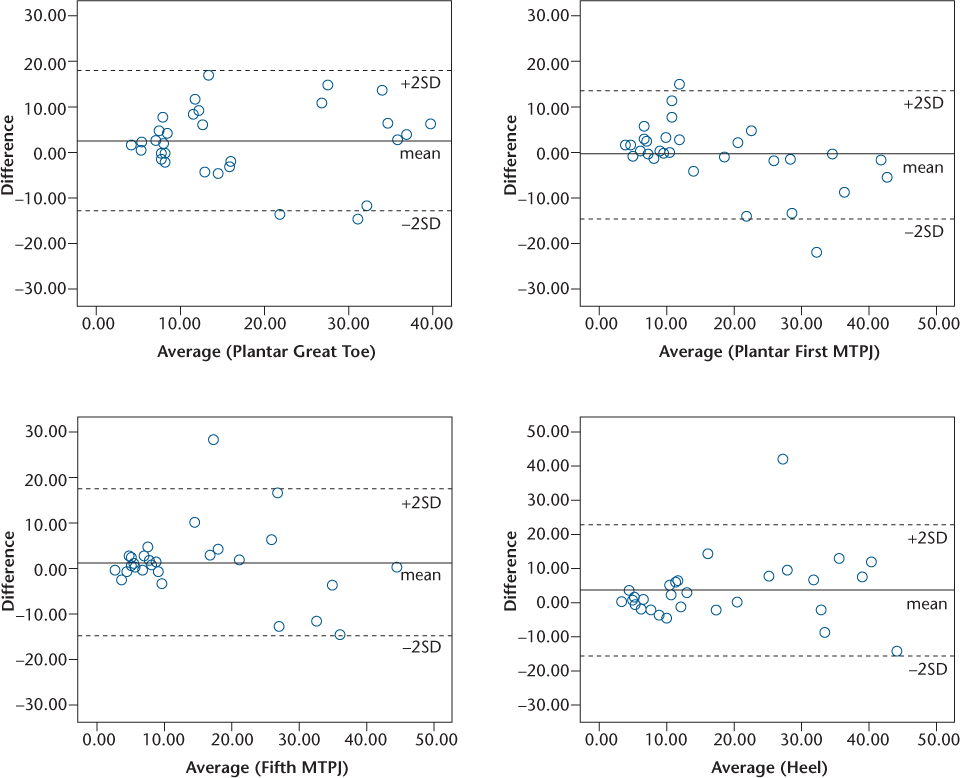 The ICC(2,1) values for NT can be considered generally good, with the highest ICC(2,1) for the plantar first metatarsophalangeal joint (ICC[2,1] = 0.84, P < .001). The lowest ICC(2,1) was found for the plantar aspect of the heel (ICC[2,1] = 0.73, P < .001) (Table 2). High ICC(2,1) values were supported by low SEM values and low mean differences, with associated 95% CIs that include zero. Bland and Altman plots for NT (Figure 1) show excellent agreement for low vibration thresholds and good agreement for higher vibration thresholds, and almost all the differences are within the limits of agreement (±1.96 SDdiff).