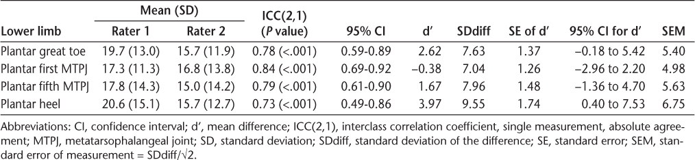 Values for ICC(2,1) measures were interpreted using the guidelines of Portney and Watkins,35 where less than 0.50 represents poor reliability, 0.50 to 0.75 represents moderate reliability, and greater than 0.75 suggests good reliability. The classification of reliability for categorical data proposed by Landis and Koch36 was used for kappa and prevalence-adjusted bias-adjusted kappa: less than 0, poor; 0.00 to 0.20, slight; 0.21 to 0.40, fair; 0.41 to 0.60, moderate; 0.61 to 0.80, substantial; and 0.81 to 1.00, almost perfect.
