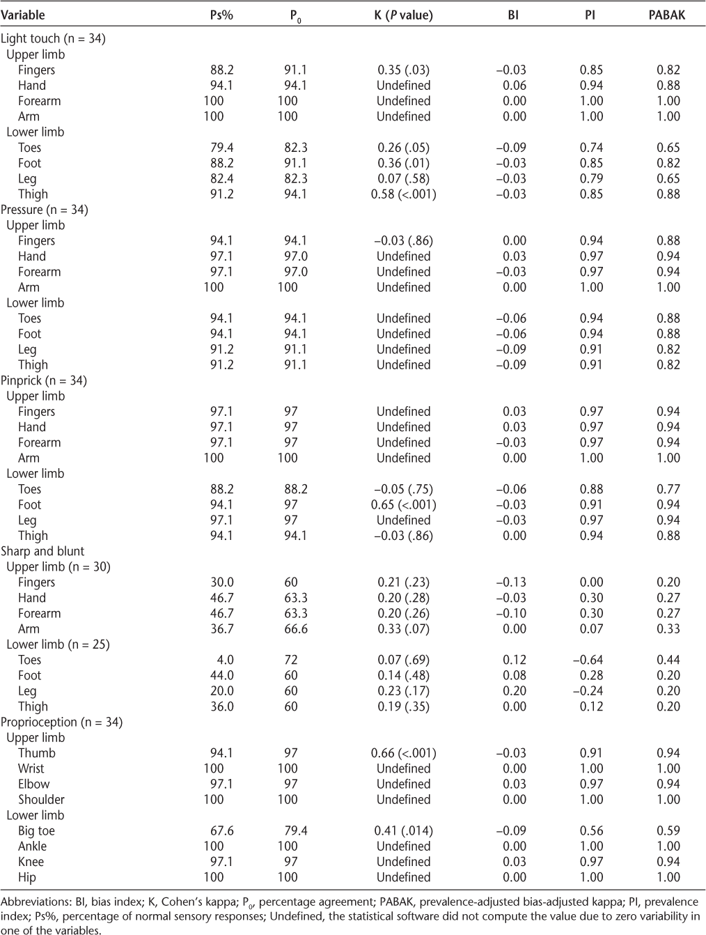 Good interrater reliability values were found for EmNSA for all sections of the test except for the sharp and blunt test (Table 4). However, further analysis showed a high Ps% for most of the test sections, indicating that nearly all the participants had normal sensory responses. Sharp and blunt was the only section of the test to identify sensory problems, and for this test the interrater reliability was poor.