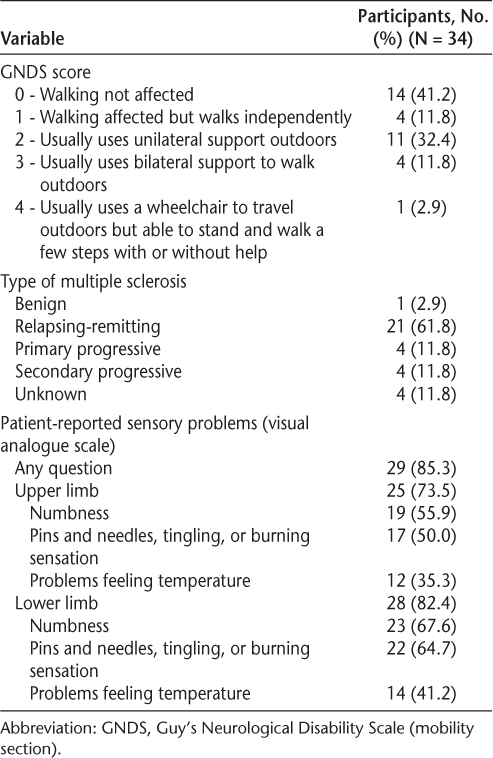 Of the 34 participants tested, 26 were women (76.5%). The mean (SD) age was 49.5 (11.13) years. The mean (SD) time since diagnosis was 12 years and 10 months (5.84 years). The greatest percentage of participants (41.2%) scored 0 on Guy's Neurological Disability Scale, which indicated that they reported that gait was not affected. The greatest percentage of participants (61.8%) were diagnosed as having relapsing-remitting MS. Twenty-nine participants (85.3%) reported a sensory problem on VAS testing. Descriptive study statistics are presented in Table 1. Detailed results of the interrater reliability testing for the NT, VAS, EmNSA, and SWMs are given in Tables 2, 3, 4, and 5.