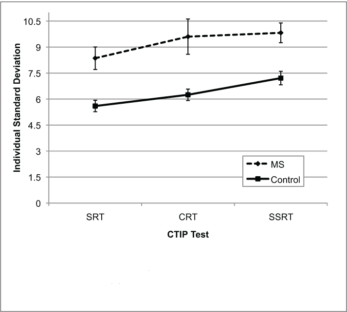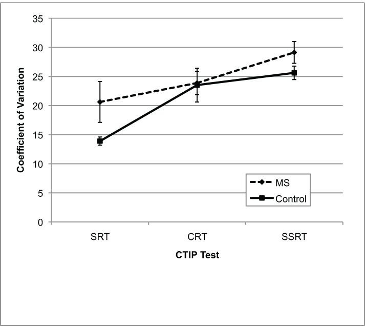 Deficits in information processing speed are among the most commonly reported cognitive difficulties in MS.3 This study examined an alternative approach to characterizing information processing speed by measuring IIV in response speed on the CTIP in a sample of MS patients and healthy controls. To our knowledge, this study represents the first investigation of within-subject variability on the CTIP in MS.