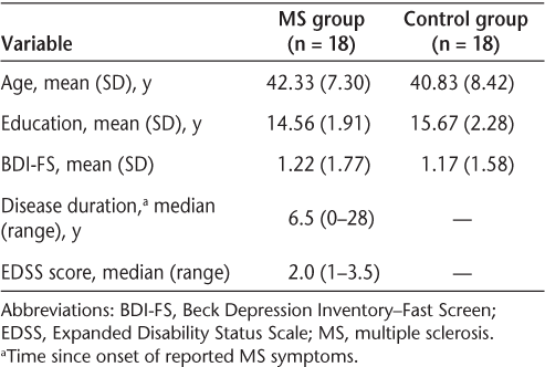 Demographic variables for the MS and control groups are presented in Table 1. The two groups were matched on age (F 1,34 = 0.326, P = .572) and years of education (F 1,34 = 2.511, P = .122) and did not differ on their self-reported symptoms of depression (F 1,34 = 0.01, P = .921). Because no differences in depressive symptoms between the two groups were found, this variable was excluded from further analyses. For MS participants, the median EDSS score was 2.0 (range, 1–3.5), and the median duration of disease as measured in years since onset of reported MS symptoms was 6.5 (range, 0–28).