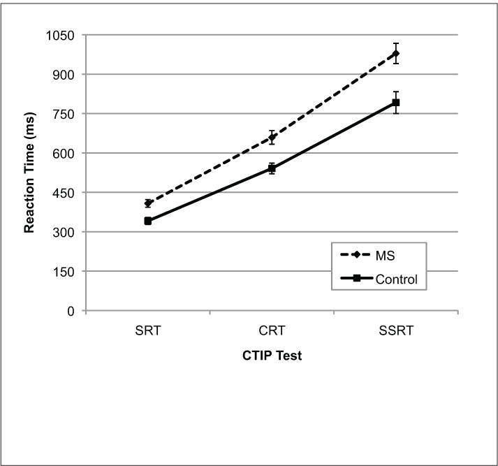 As shown previously by Tombaugh and colleagues,9 we found that MS patients demonstrated slowing in mean response time on all three CTIP subtests compared with healthy controls, despite being equally accurate in their performance. In addition, we found that MS patients' response speed became increasingly slower than that of controls on the more cognitively demanding subtest (ie, SSRT; Figure 1). The consistency of these findings with previous reports in MS suggests that the CTIP may be a reliable clinical measure of processing speed deficits in this disease.